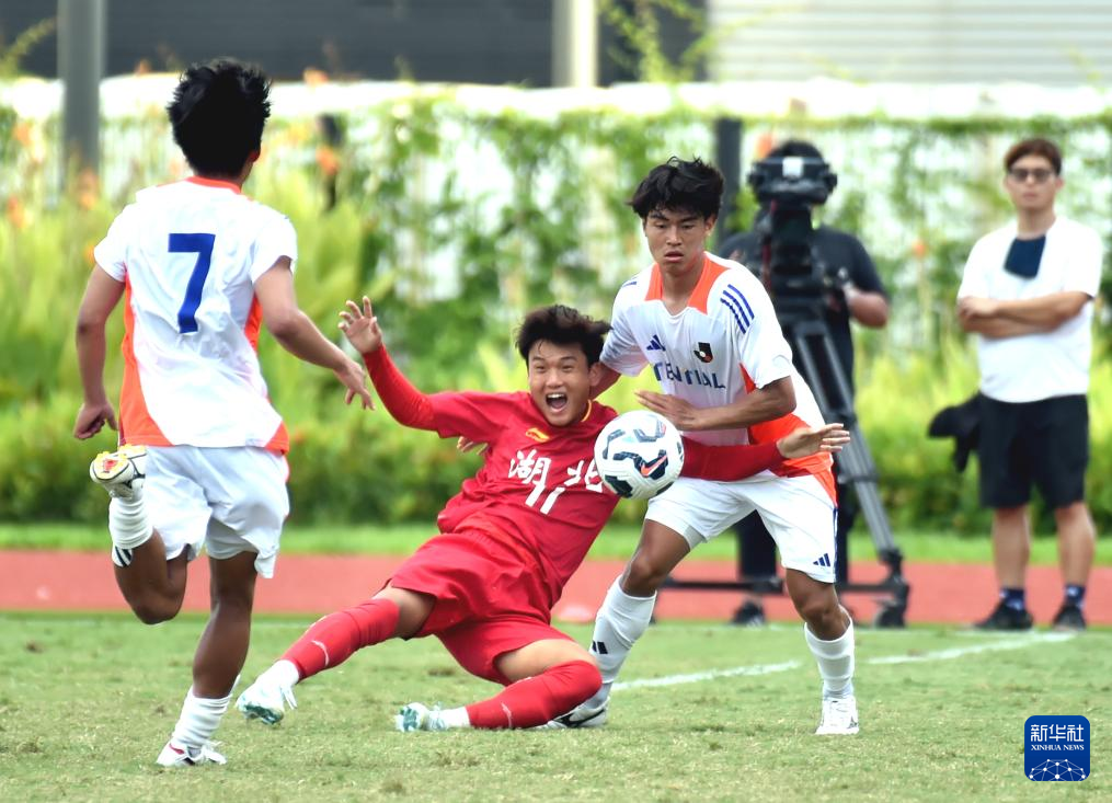 6月8日,中国湖北U-18队球员黄钵(中)与日本职业联赛U-20队球员野田裕人拼抢。