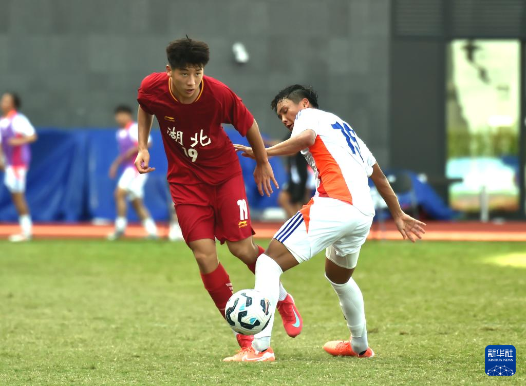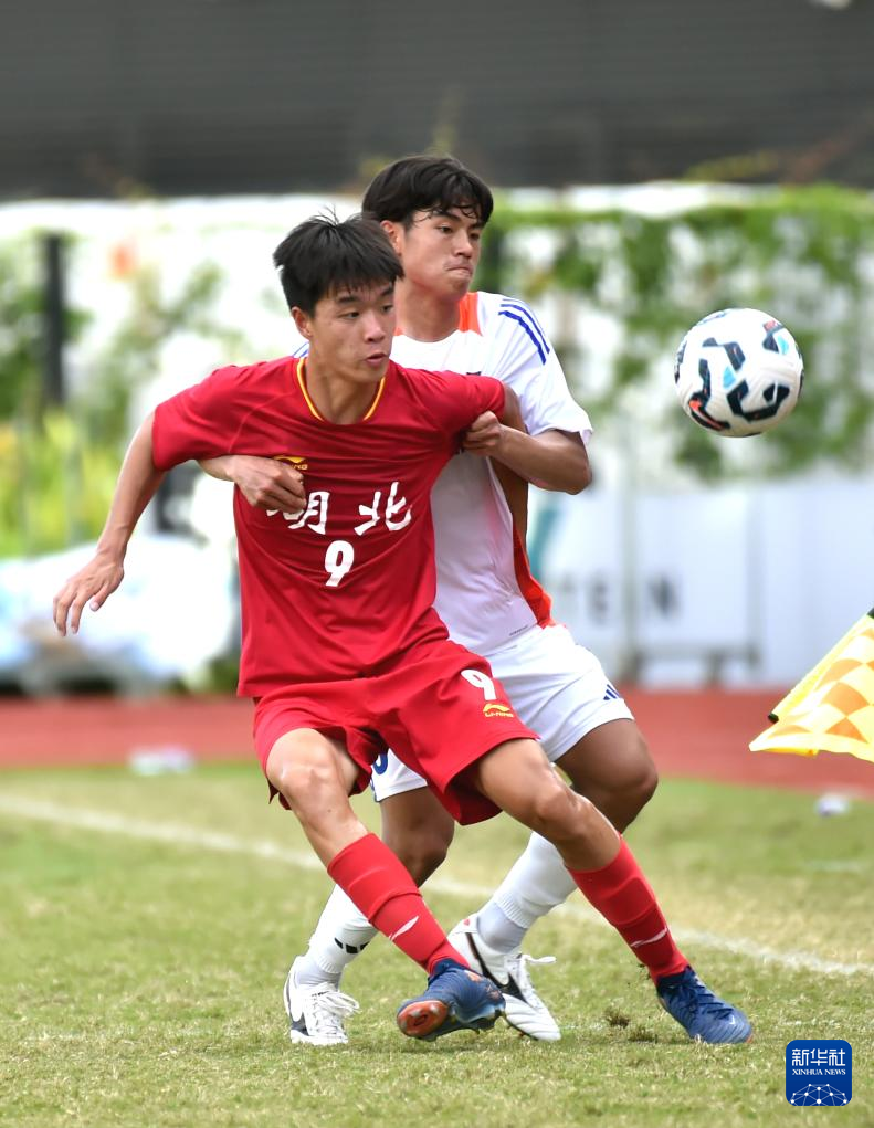 6月8日,中国湖北U-18队球员林子皓(左)与日本职业联赛U-20队球员岛本悠大拼抢。