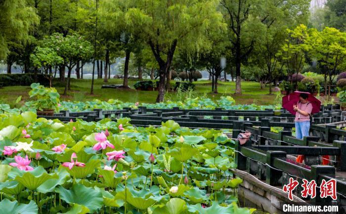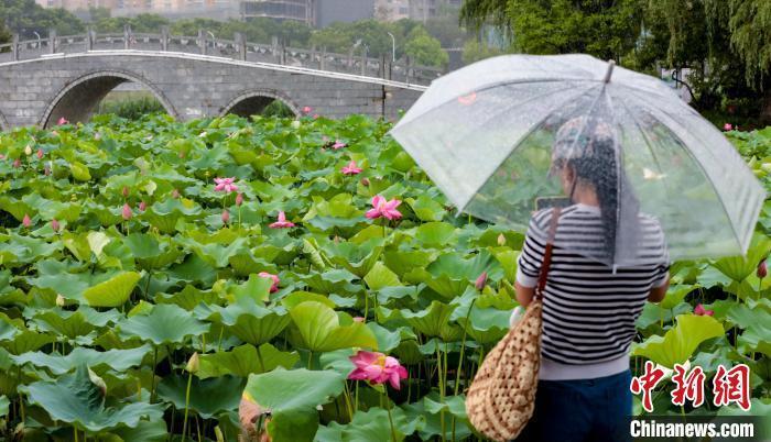 6月19日,武汉沙湖公园的荷花在雨中盛放,雨滴落在荷叶上清脆作响,荷花的芬芳随风飘散,令人沉醉。市民纷纷驻足赏荷拍照,感受“雨荷映夏”的诗意夏日。图为市民雨中赏荷。中新社记者 张畅 摄