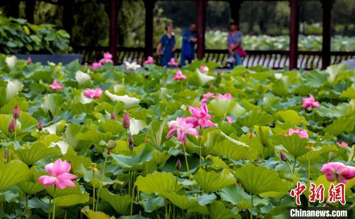 6月19日,武汉沙湖公园的荷花在雨中盛放,雨滴落在荷叶上清脆作响,荷花的芬芳随风飘散,令人沉醉。市民纷纷驻足赏荷拍照,感受“雨荷映夏”的诗意夏日。图为市民赏荷拍照。中新社记者 张畅 摄
