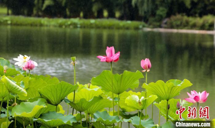 6月19日,武汉沙湖公园的荷花在雨中盛放,雨滴落在荷叶上清脆作响,荷花的芬芳随风飘散,令人沉醉。市民纷纷驻足赏荷拍照,感受“雨荷映夏”的诗意夏日。图为雨中开放的荷花。中新社记者 张畅 摄