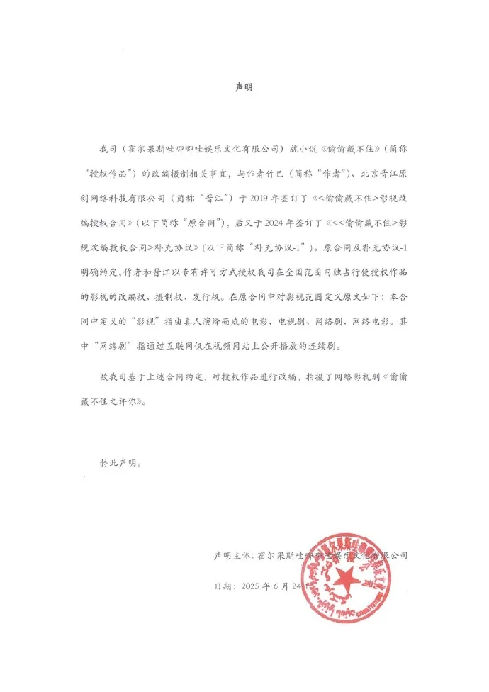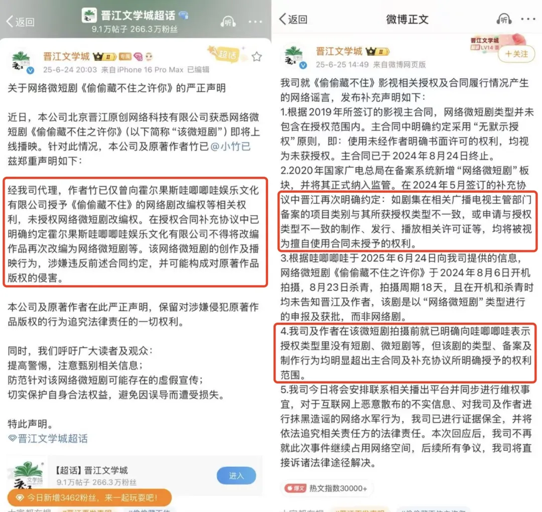 6月24、25日,@晋江文学城 先后发布两条声明,指控哇唧唧哇未经授权拍摄微短剧《偷偷藏不住之许你》,涉嫌违反合同约定。晋江强调合同仅授权网络剧(长剧)改编权,且2024年补充协议明确禁止二次改编为微短剧。
