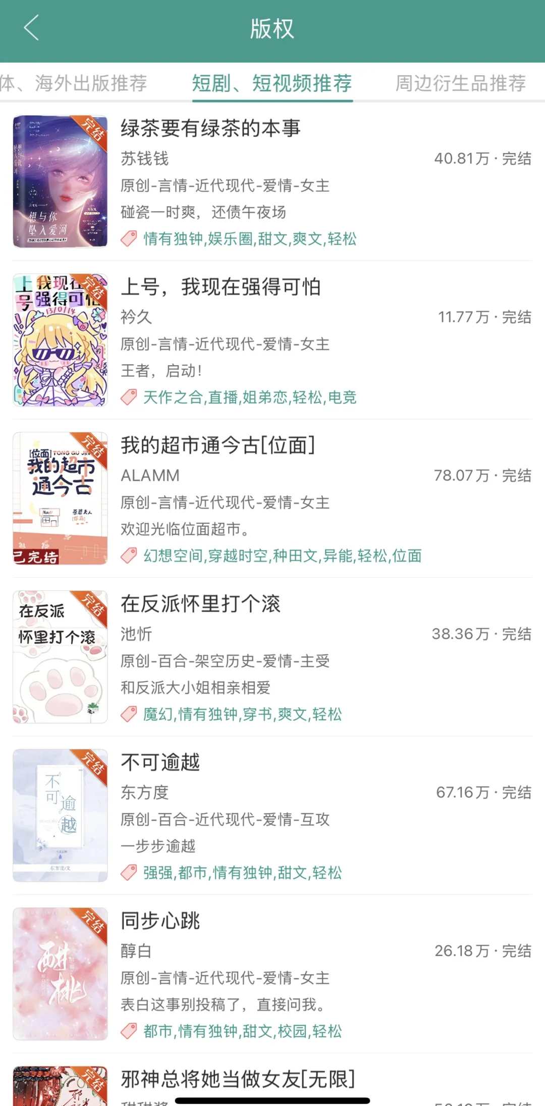 值得注意的是,一些原来向长剧市场输送IP的小说网站已经开始售卖微短剧版权。以晋江文学城为例,其版权板块目前已经开设“短剧、短视频推荐”专栏。