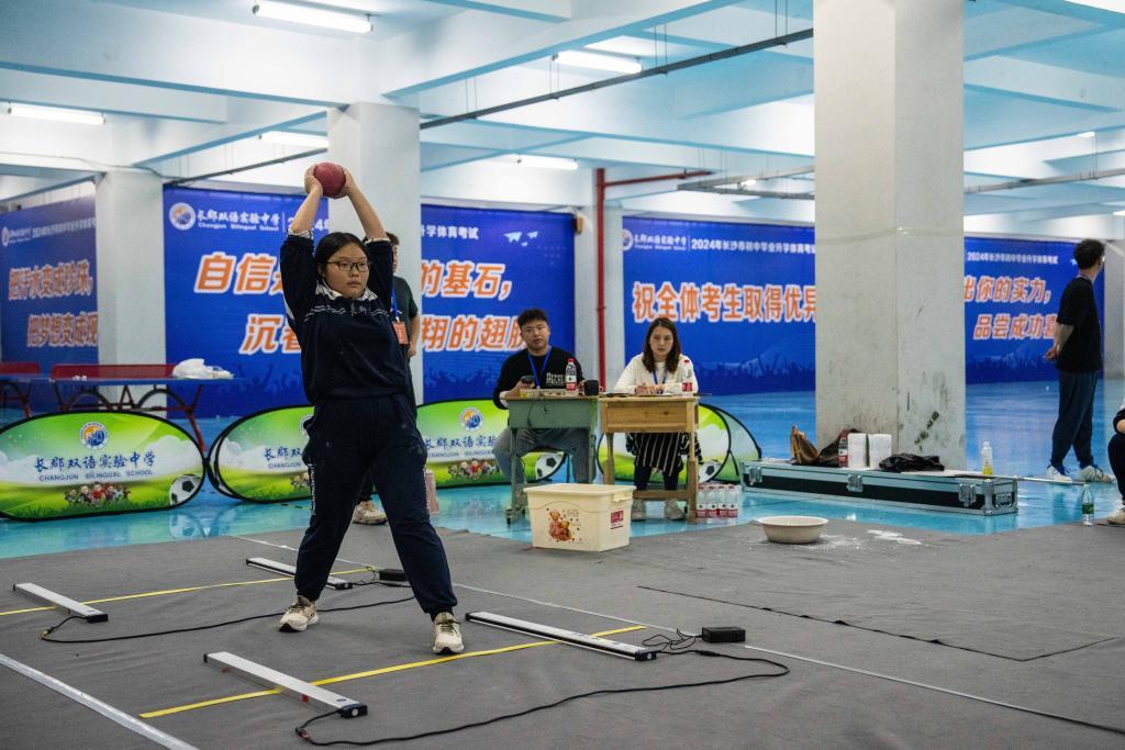 4月16日,在长沙市长郡双语实验中学,考生在进行投掷实心球考试。新华社记者 陈思汗 摄