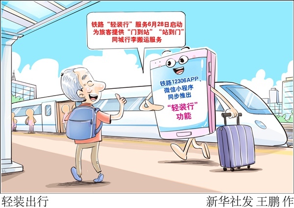 新华社北京6月28日电(记者樊曦)记者从中铁快运股份有限公司获悉,28日起,铁路部门在北京西、上海虹桥、广州南等19座车站试点开展“轻装行”服务,为旅客提供“门到站”“站到门”同城行李搬运服务,铁路12306APP、微信小程序同步推出“轻装行”功能,旅客可通过线上预约办理,将有效减轻携带大件行李出行的负担,乘坐火车出行更加方便快捷。