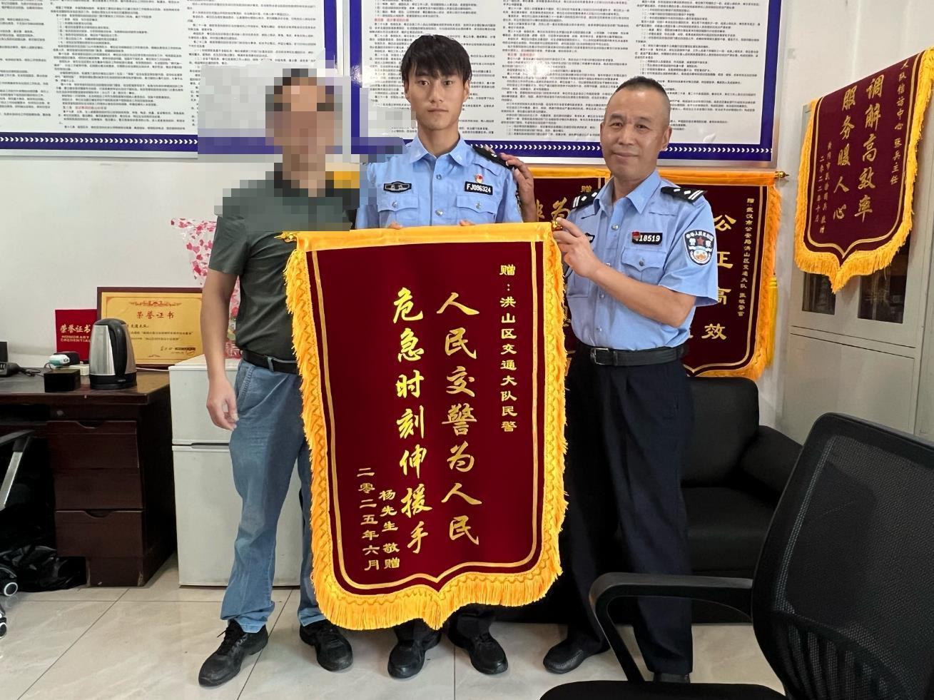 “感谢交警,多亏有你们帮助,我父亲才脱离了生命危险……”7月3日,武汉市民杨先生将一面鲜红的锦旗,送到洪山区公安分局交通管理大队汉警快骑队员陈虎、李圻手中,对交警及时护送其父亲就医表示由衷的感谢。