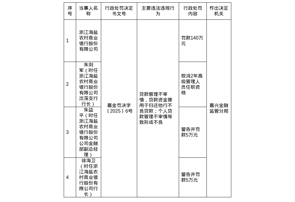 7月2日,国家金融监督管理总局嘉兴监管分局披露的行政处罚信息显示,浙江海盐农商银行因存在贷款管理不审慎、贷款资金被挪用于归还他行不良贷款、个人贷款管理不审慎导致形成不良等问题,被处以140万元罚款。相关责任人也受到相应处罚:时任海盐农商银行沈荡支行行长朱剑军被取消2年高级管理人员任职资格;时任海盐农商银行行长朱益平、时任公司金融部副总经理徐海卫均受到警告处分,且分别被罚款5万元。