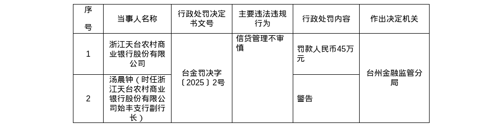 除上述三家农商行外,近期还有2家农商行因违规行为受到处罚。2025年7月7日,国家金融监督管理总局台州监管分局行政处罚信息公示表显示:浙江天台农村商业银行因信贷管理不审慎,被罚款45万元;同时对汤晨钟(时任浙江天台农村商业银行始丰支行副行长)处以警告。
