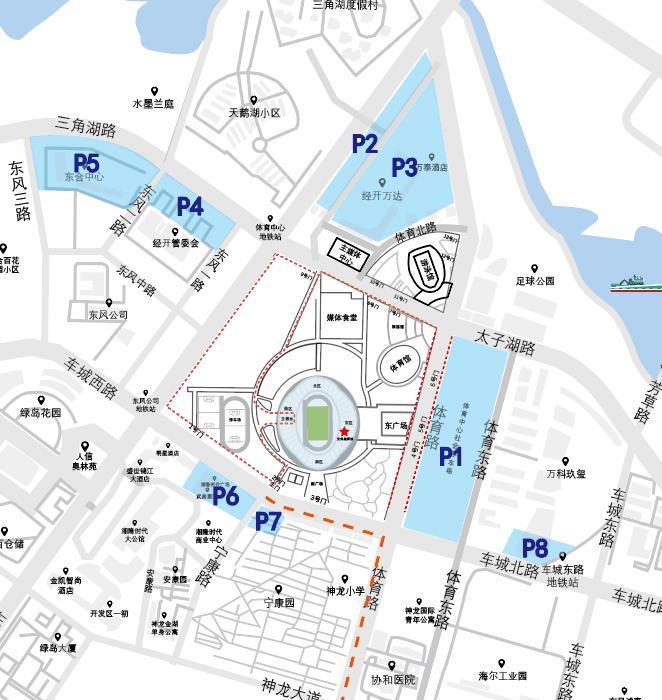 (3)乘坐公交至东风大道三角湖路站,沿东风大道——太子湖路——体育路线路前往体育中心3、4、5号门观众出入口。