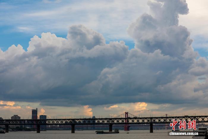 7月21日,武汉夏日的天空被各式云朵簇拥。云朵在天空中快速流动,瞬息万变形态万千。图为武汉城市上空云山堆积。中新社记者 张畅 摄