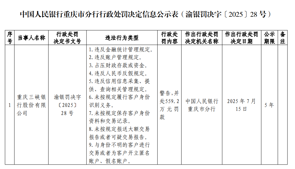 金融界7月30日消息,中国人民银行重庆市分行对重庆三峡银行股份有限公司开出罚单(渝银罚决字〔2025〕28号),因该行存在9项违法违规行为,包括违反金融统计管理、账户管理、反洗钱规定(未履行客户身份识别、保存交易记录、报送大额交易报告等),以及占压财政存款、违反人民币反假规定等,被处以警告并罚款559.2万元。相关处罚信息将公示5年。