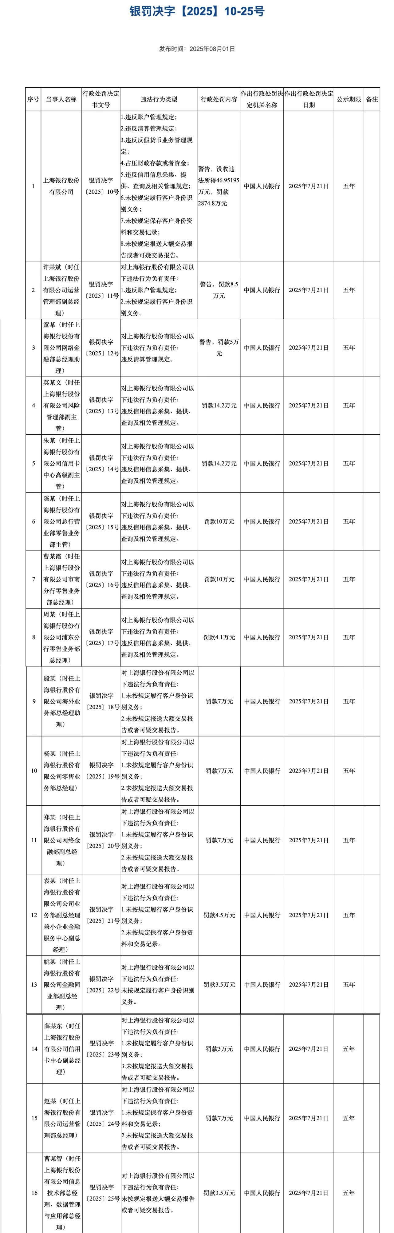 8月1日,中国人民银行行政处罚公示显示,上海银行被警告,并没收违法所得46.95195万元,罚款2874.8万元,涉及的违法行为类型包括:违反账户管理规定;违反清算管理规定;违反反假货币业务管理规定;占压财政存款或者资金;违反信用信息采集、提供、查询及相关管理规定;未按规定履行客户身份识别义务;未按规定保存客户身份资料和交易记录;未按规定报送大额交易报告或者可疑交易报告。