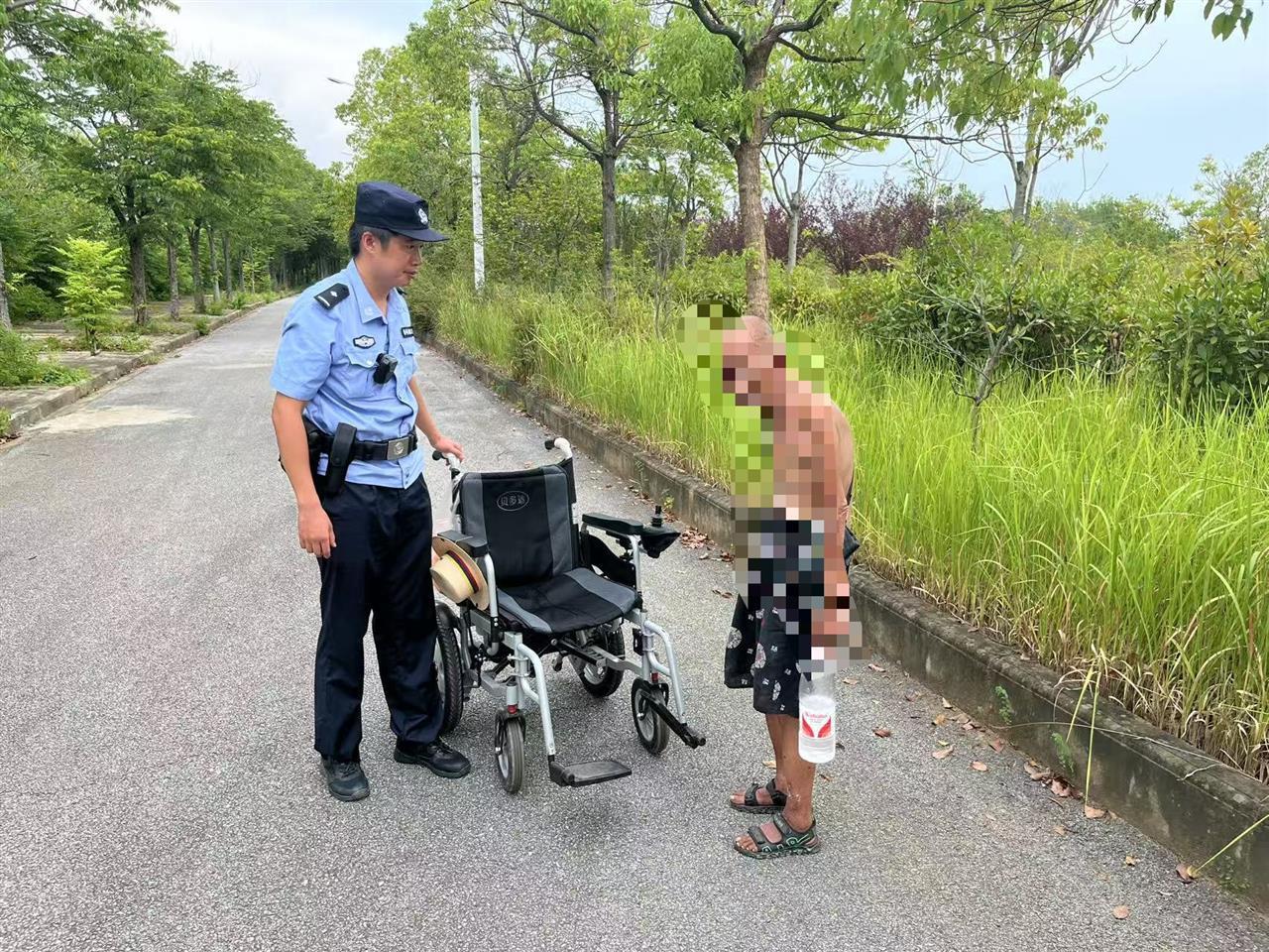 接警后,民警朱晓威、辅警杨柯立即驱车赶赴现场。报警地点位于横店、天河交界处,周围没有任何建筑物,人烟稀少,距离最近有人居住生活的地方也要3公里左右。朱晓威和杨柯抵达现场后,只见一位老人蜷缩在树荫下,身旁电动轮椅电量耗尽,此时户外温度高达37℃。