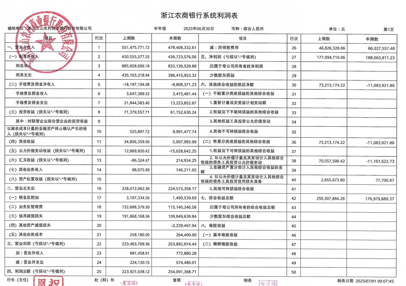 其他综合收益的税后净额由正转负,呈现亏损状态。本期其他综合收益的税后净额为–0.11亿元,而上期数为0.73亿元,同比降幅达115.14%,这一转变反映出银行在投资等业务上遇到不利情况,导致综合收益受到拖累。