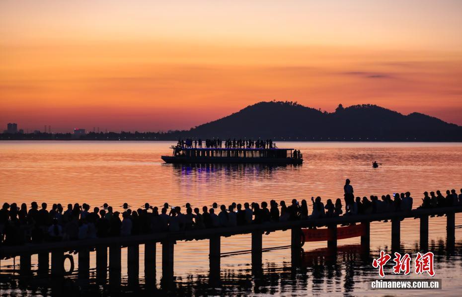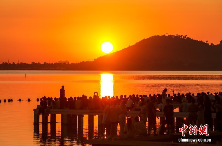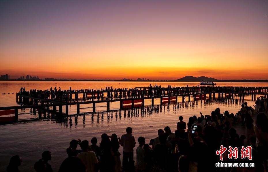 8月16日清晨,朝霞映满武汉东湖,放眼看去,红霞之下的湖区水天一色,景色蔚为壮观。图为游人在东湖凌波门栈道上观赏日出。中新社记者 张畅 摄