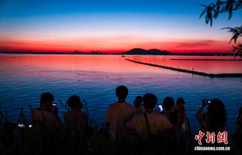 8月16日清晨,朝霞映满武汉东湖,放眼看去,红霞之下的湖区水天一色,景色蔚为壮观。图为美丽的朝霞吸引游客观赏拍照。中新社记者 张畅 摄