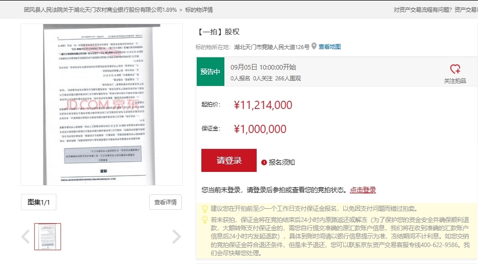 日前,据京东司法拍卖平台,湖北天门农商银行700万股股权将于9月5日公开拍卖,评估价1246万元,每股1.78元,起拍价1121.4万元,每股1.602元,较评估价打了九折,该笔股权占天门农商银行总股本的1.89%。