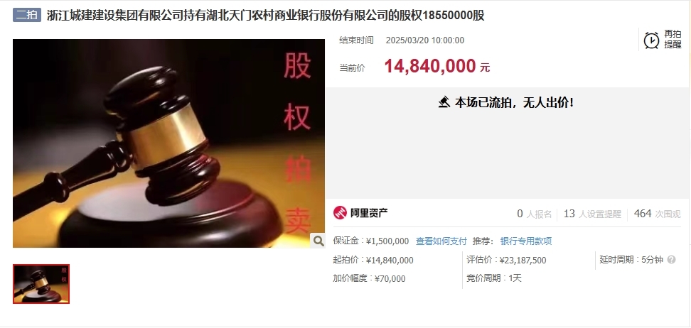 2025年3月,天门农商银行另一法人股东浙江城建建设集团有限公司所持有的该行1855万股股权公开拍卖,同样经历两轮拍卖,起拍价从1855万元降至1484万元,终因无人出价而流拍。