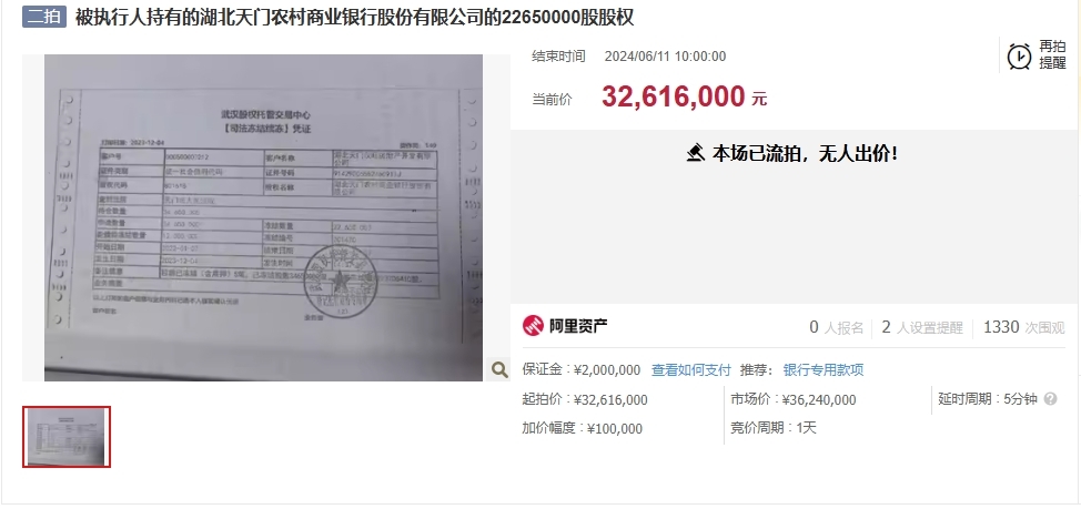 查询发现,天门农商银行大额股权多次遭司法拍卖。阿里司法拍卖平台显示,2024年6月,湖北汉旺房地产持有的天门农商银行2265万股股权二拍流拍,这笔股权在司法平台上起拍价格从3624.00万元下降至3261.60万元,但终因无人出价而流拍。