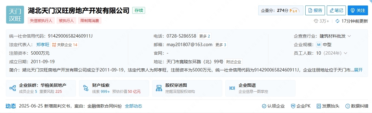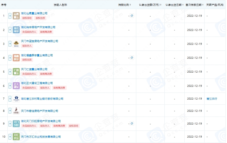 该笔股权持有人为湖北天门汉旺房地产开发有限公司,目前该公司已成失信被执行人并被限制高消费。其司法案件达191条,裁判文书89条,立案信息279条,开庭公告26条。