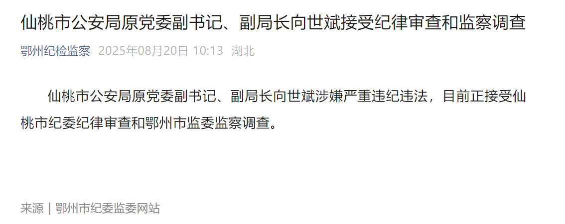 据鄂州市纪委监委网站8月20日消息,仙桃市公安局原党委副书记、副局长向世斌涉嫌严重违纪违法,目前正接受仙桃市纪委纪律审查和鄂州市监委监察调查。