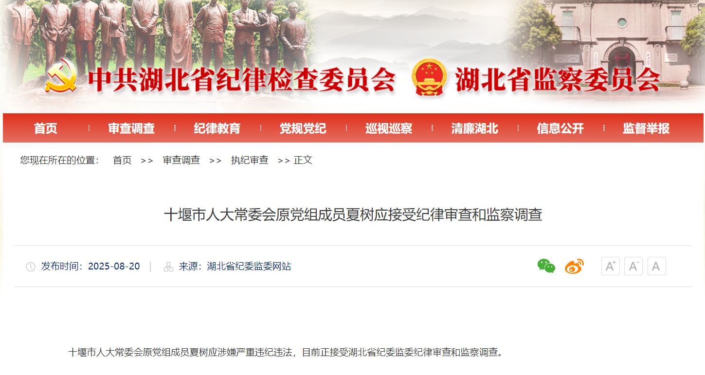 据湖北省纪委监委网站8月20日消息,十堰市人大常委会原党组成员夏树应涉嫌严重违纪违法,目前正接受湖北省纪委监委纪律审查和监察调查。