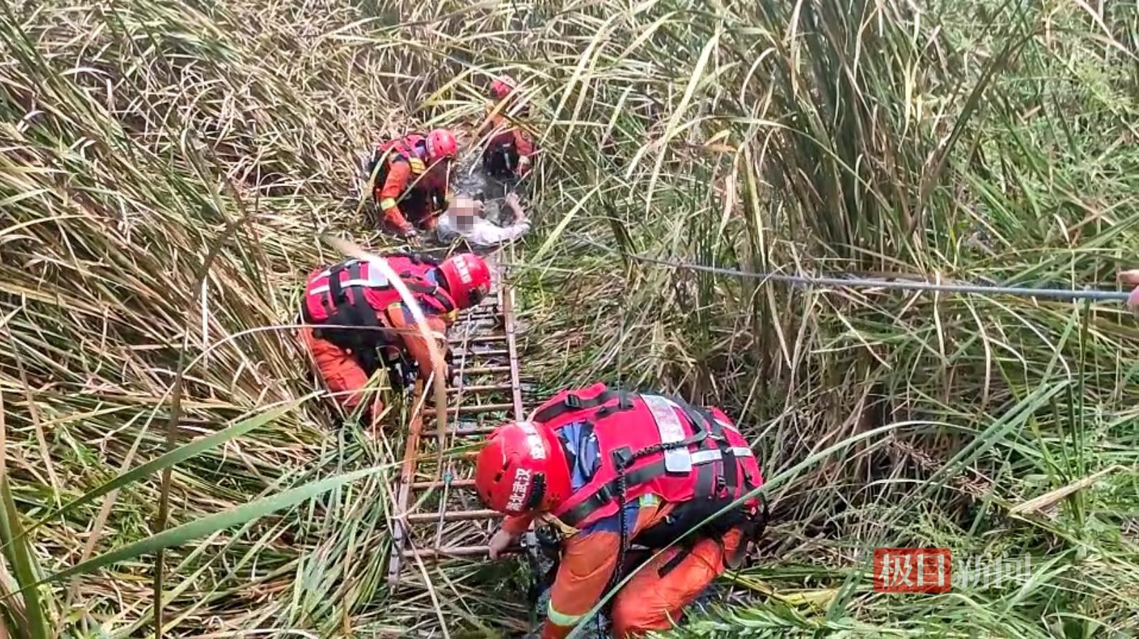 在勘察地形后,几名消防员迅速绑好安全绳、穿戴好水域救援装备,进入池塘实施救援。刚一踏入池塘,淤泥便没过消防员的膝盖,淤泥深处黏稠湿滑,每前进一步都十分艰难,并且散发出腐臭气味。消防员将两节拉梯铺在淤泥表面,沿梯靠近老人。此时老人意识清醒,手中还握着铁锹和柴刀,但整个身体被淤泥紧紧困住,皮肤因长时间浸泡已发白起皱。消防员合力将老人从淤泥中救出,并转移至拉梯上。随后,四名消防员在泥泞中协力将拉梯拖回岸边,把老人抬上担架,移交给120医护人员送医救治。