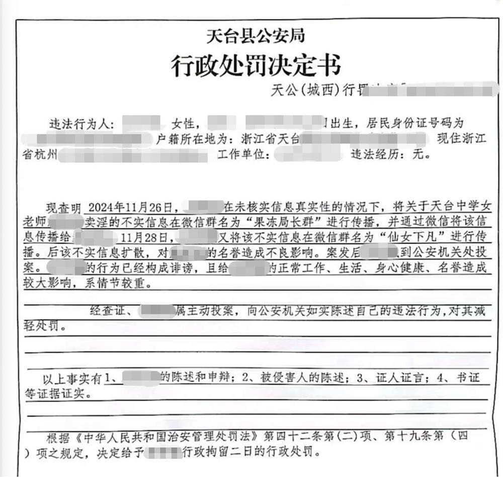 极目新闻此前报道,林女士提供的《行政处罚决定书》显示,天台县警方查明,2024年11月26日,她在未核实信息真实性的情况下,将关于另一教师卖淫的不实信息在3人微信群“果冻局长群”进行传播,并通过微信将该信息传播给吴某某(化姓)。11月28日,林女士又将该不实信息在3人微信群“仙女下凡”进行传播。