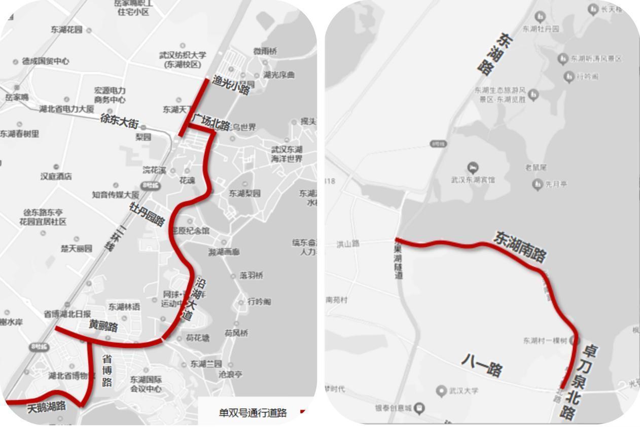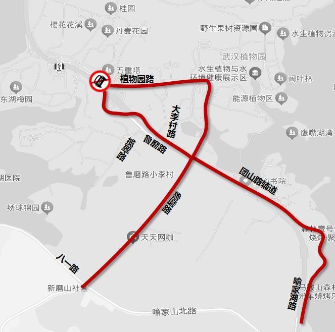 鲁磨路(八一路至樱花园大门)、团山路辅道(喻家湖路 至团山路)、植物园路(鲁磨路至团山路)、东湖南路(洪山路至卓刀泉北路)、卓刀泉北路(东湖南路)
