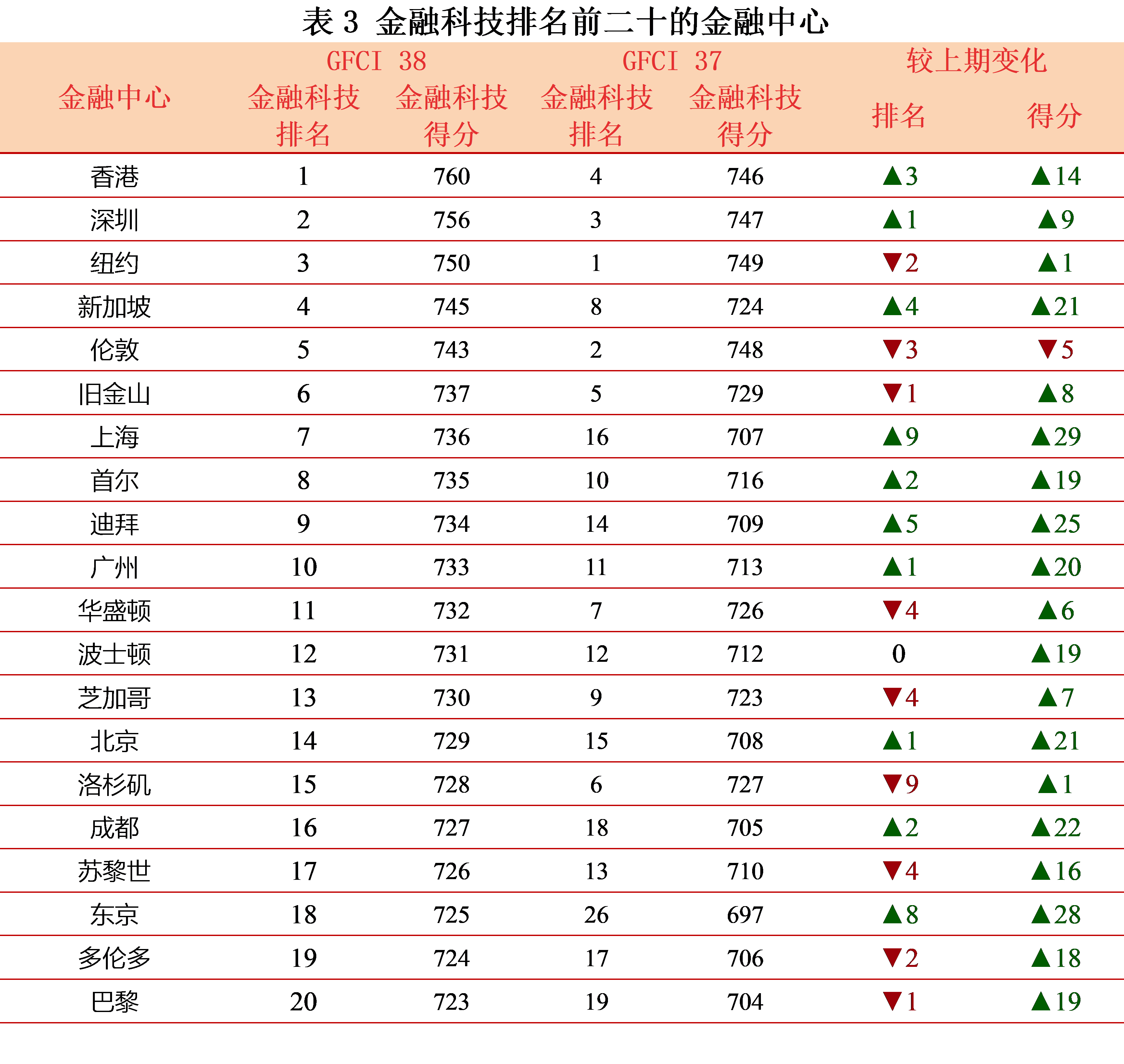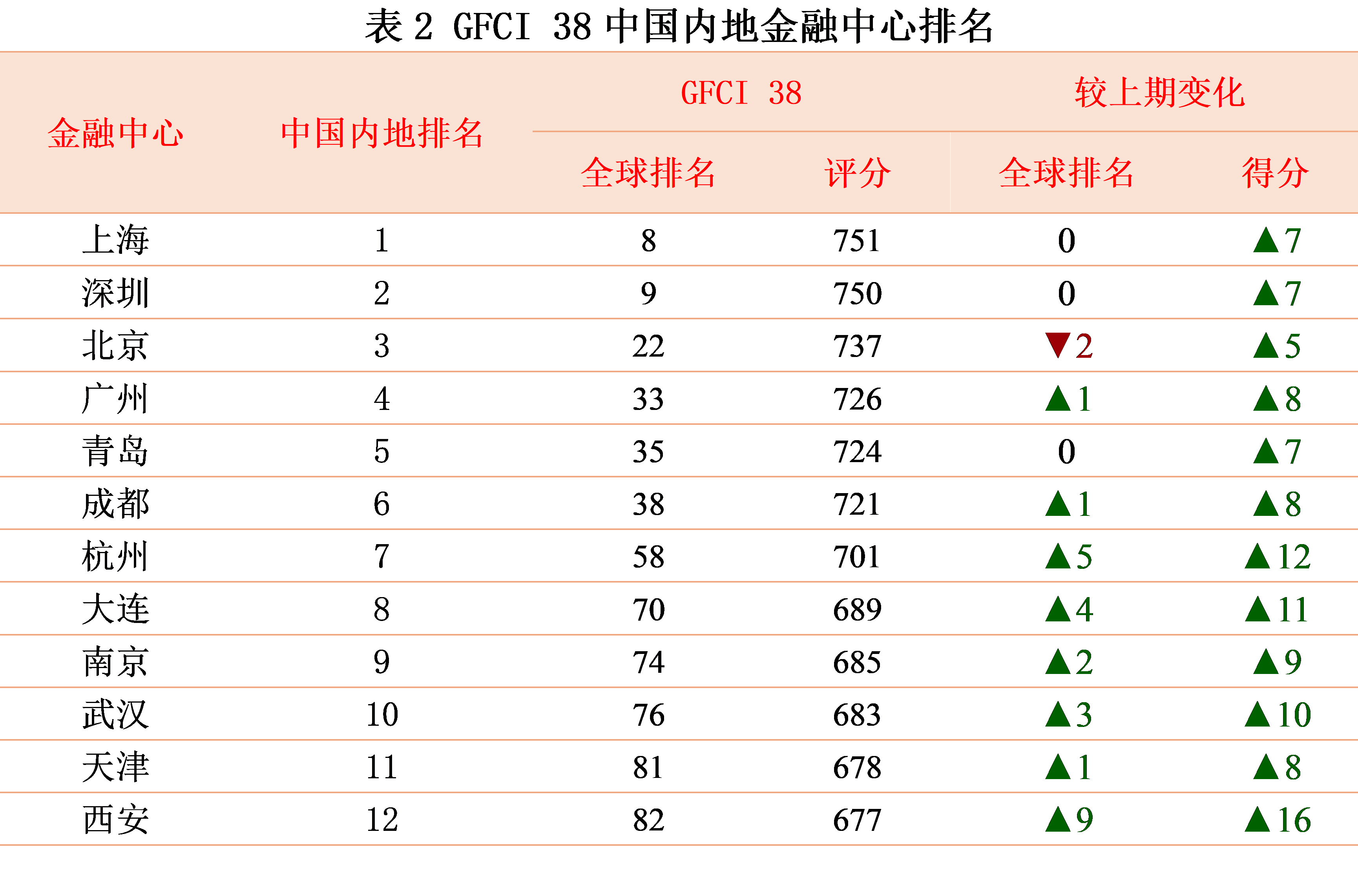 中国内地所有金融中心评分均有所上升,其中8个金融中心排名再次上升,包括广州(上升1位)、成都(上升1位,全球第38)、杭州(上升5位,全球第58)、大连(上升4位,全球第70)、南京(上升2位,全球第74)、武汉(上升3位,全球第76)、天津(上升1位,全球第81)、西安(上升9位,全球第82)。