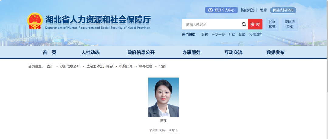 10月12日查询湖北省人力资源和社会保障厅官网信息显示,马丽已任湖北省人社厅党组成员、副厅长。分管宣传教育与政务服务处、就业促进和失业保险处、人力资源流动管理处、农民工工作处、表彰奖励工作处、省劳动就业服务中心、省公共就业创业指导与信息服务中心、省人力资源和社会保障信息中心。