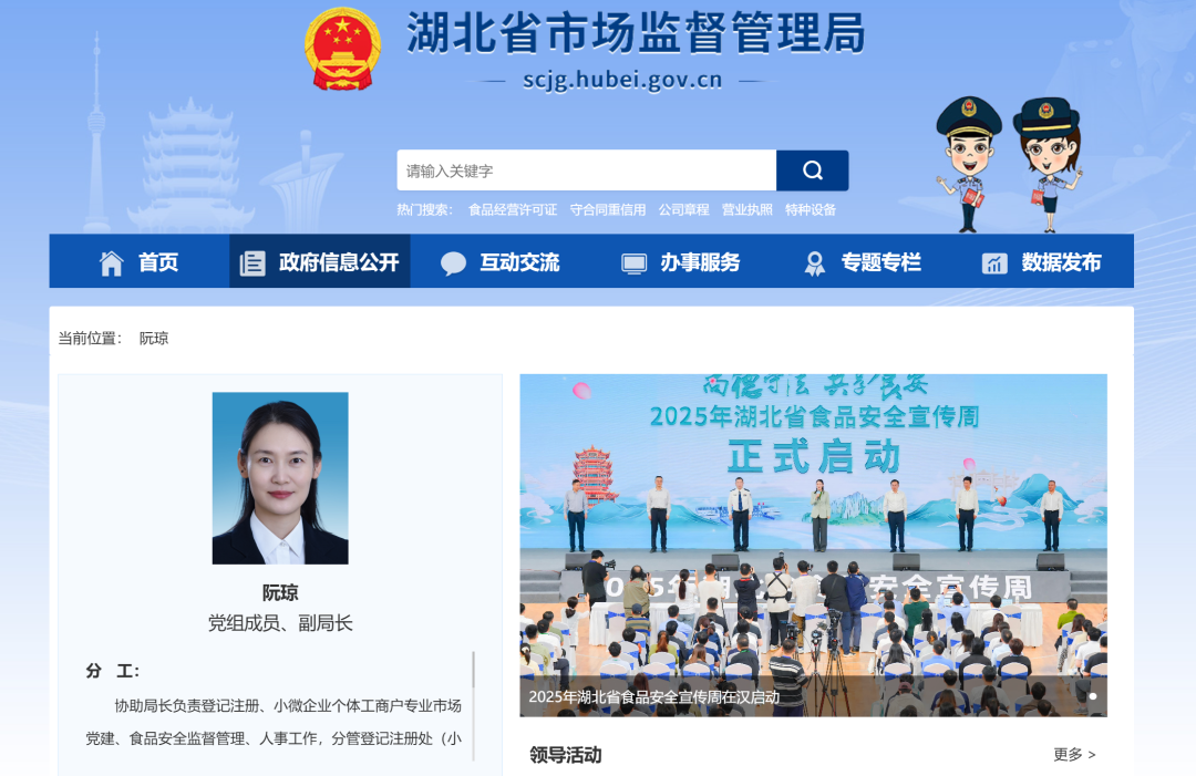 10月13日查询湖北省市场监督管理局官网显示,阮琼已任湖北省市场监督管理局党组成员、副局长。