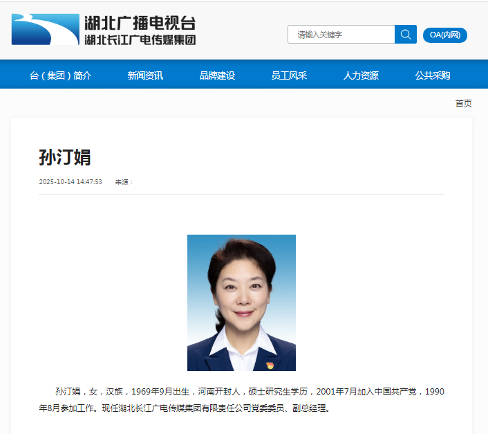 10月20日,查询湖北广播电视台官网显示,孙汀娟已任湖北长江广电传媒集团有限责任公司党委委员、副总经理。