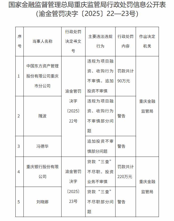 原标题:东方资产重庆分公司、重庆银行分别领罚!重庆金融监管局开具罚单,涉三人违规合计罚310万