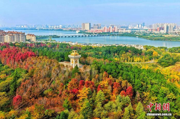 11月4日,武汉藏龙岛国家湿地公园的秋景美不胜收。从空中俯瞰,公园内山水相依,层林尽染。枫叶如火焰,与金黄的银杏叶相交织,构成一幅绚丽多彩的画面。该园位于武汉市江夏区汤逊湖畔,是典型的城郊淡水湿地,已成为附近居民休闲放松、亲近自然的好去处。(无人机照片)周星亮 摄