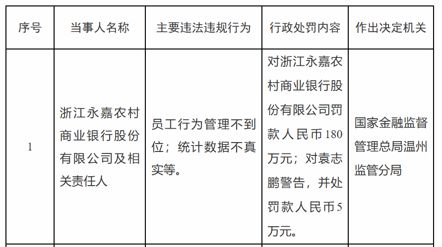 原标题:浙江永嘉农商行被罚180万,涉统计数据不真实等