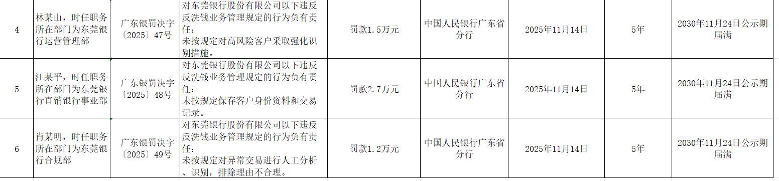 广东银罚决字〔2025〕49号显示,肖某明(时任职务所在部门为东莞银行合规部)被罚款1.2万元。