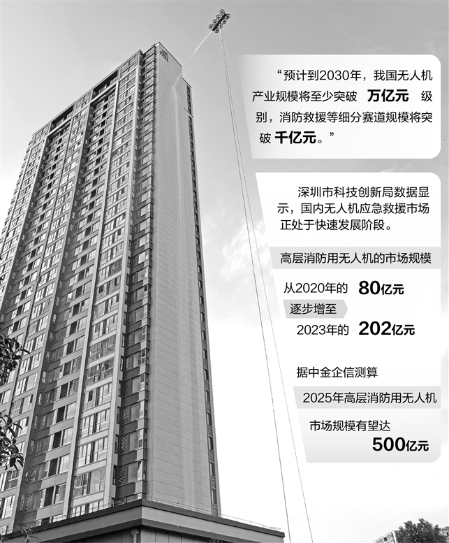 尽管技术仍未完全迈向成熟,消防无人机市场却已展现出广阔的蓝海。深圳市科技创新局数据显示,国内无人机应急救援市场正处于快速发展阶段,高层消防用无人机的市场规模从2020年的80亿元逐步增至2023年的202亿元。据中金企信测算,2025年高层消防用无人机市场规模有望达500亿元。