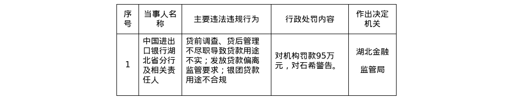 罚单显示,中国进出口银行湖北省分行的主要违法违规行为是:贷前调查、贷后管理不尽职导致贷款用途不实,发放贷款偏离监管要求,银团贷款用途不合规。