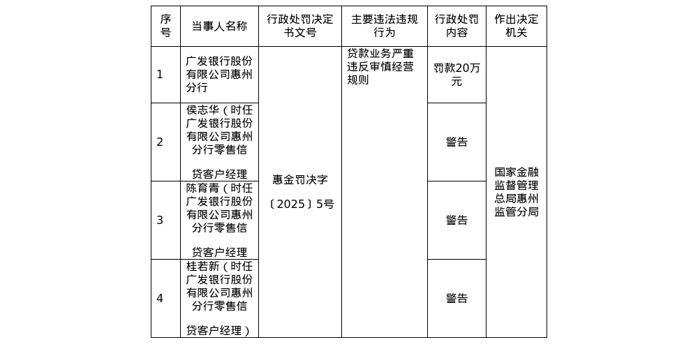 针对上述行为,国家金融监督管理总局惠州监管分局对其罚款20万元;对零售信贷客户经理侯志华、陈育青、桂若新警告。