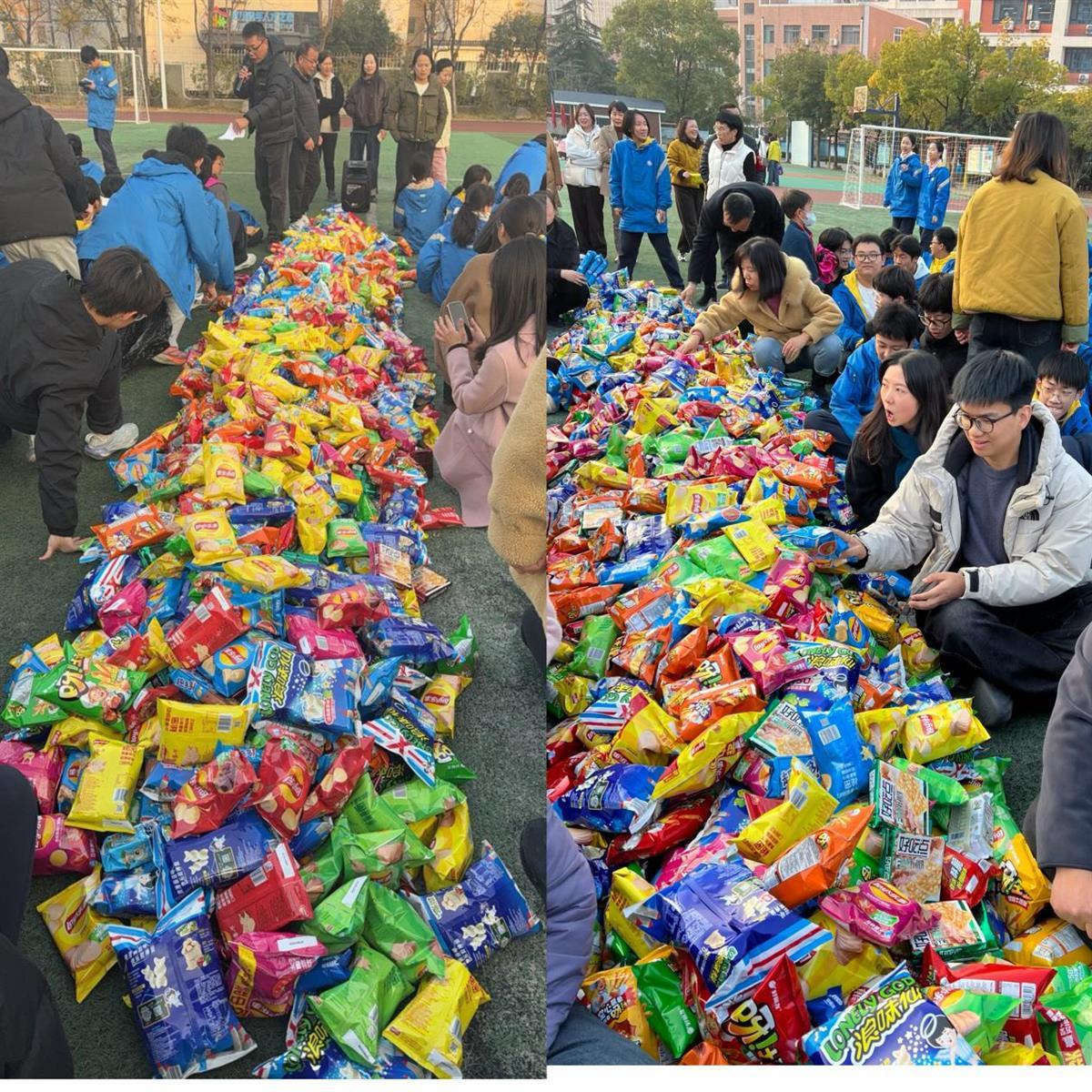 据介绍,该活动旨在让九年级学生走出课堂,在轻松愉快的氛围中释放压力、凝聚力量。活动现场,老师们精心布置的零食展台十分吸睛,薯片、饼干、巧克力等各类零食包装鲜艳、整齐排列,等待着学生开启“战斗”。