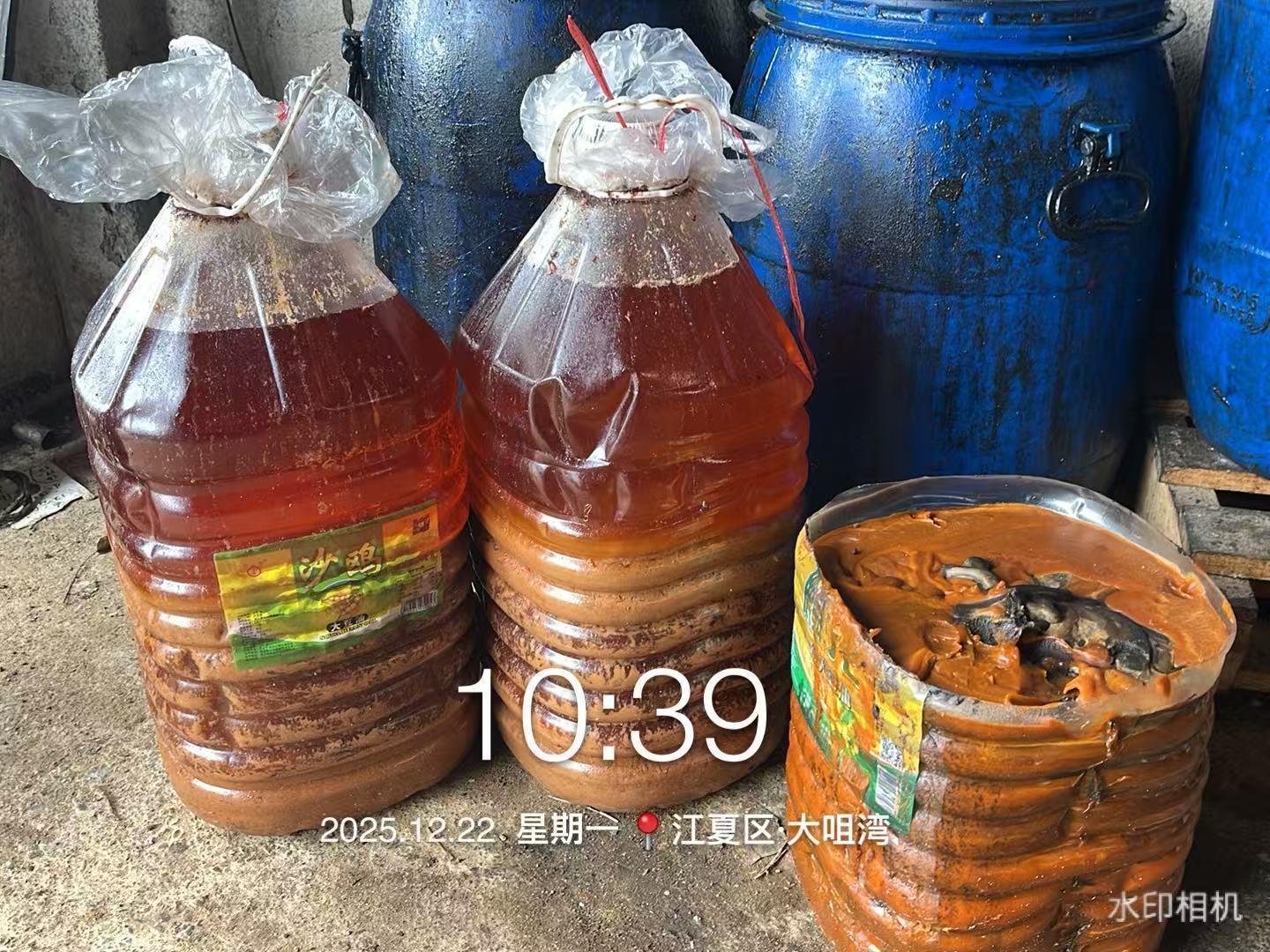 12月22日,武汉市江夏区城管局综合执法大队根据群众举报,联合东湖高新区城管综合执法大队,一举端掉大咀湾辖区一处非法加工油脂的窝点,查获非法加工油脂1.3吨。