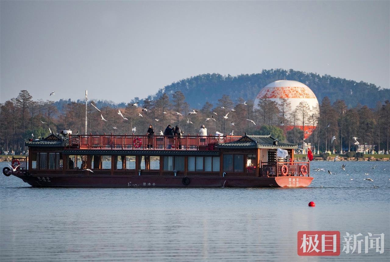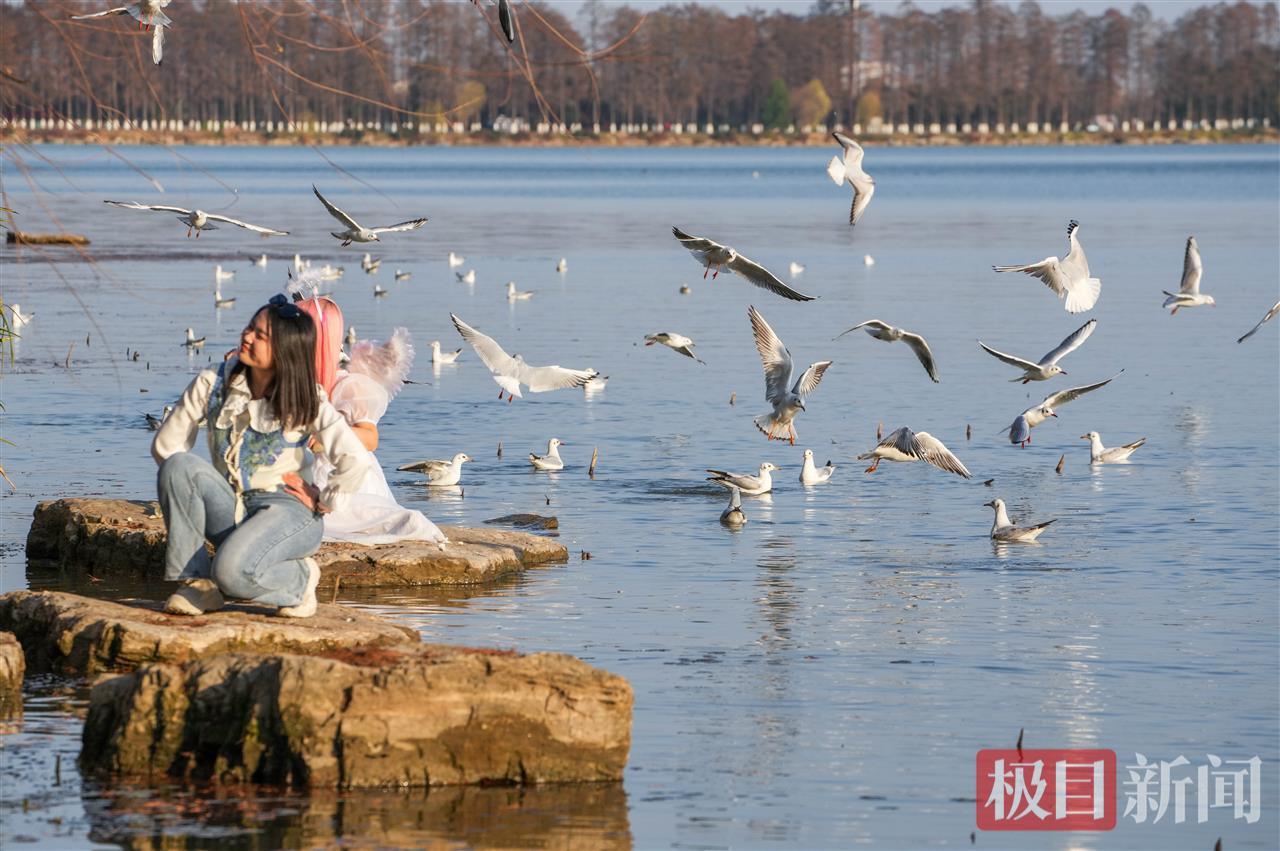 作为5A级环湖绿道,东湖绿道当天人气高涨,骑行道上不时有单车穿行,步道上游客或漫步赏景,或驻足拍照。沿楚风园向九女墩行进,湖边水面上,洁白的红嘴鸥时而低空盘旋,时而贴水掠行,鲜红的喙与脚在阳光下格外醒目。这些来自西伯利亚的“越冬客”毫不怯生,围绕游客飞舞嬉戏,引得众人纷纷举起手机记录这一盛况。