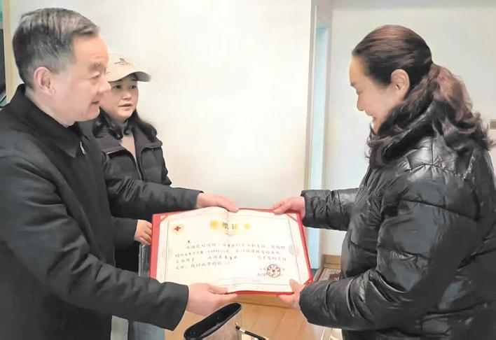 汉川市红十字会向王佑春的姐姐(右)颁发捐赠证书 通讯员供图