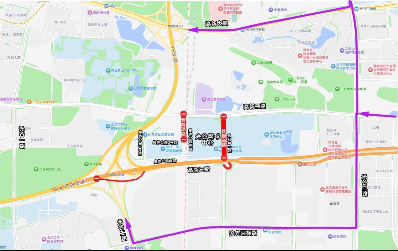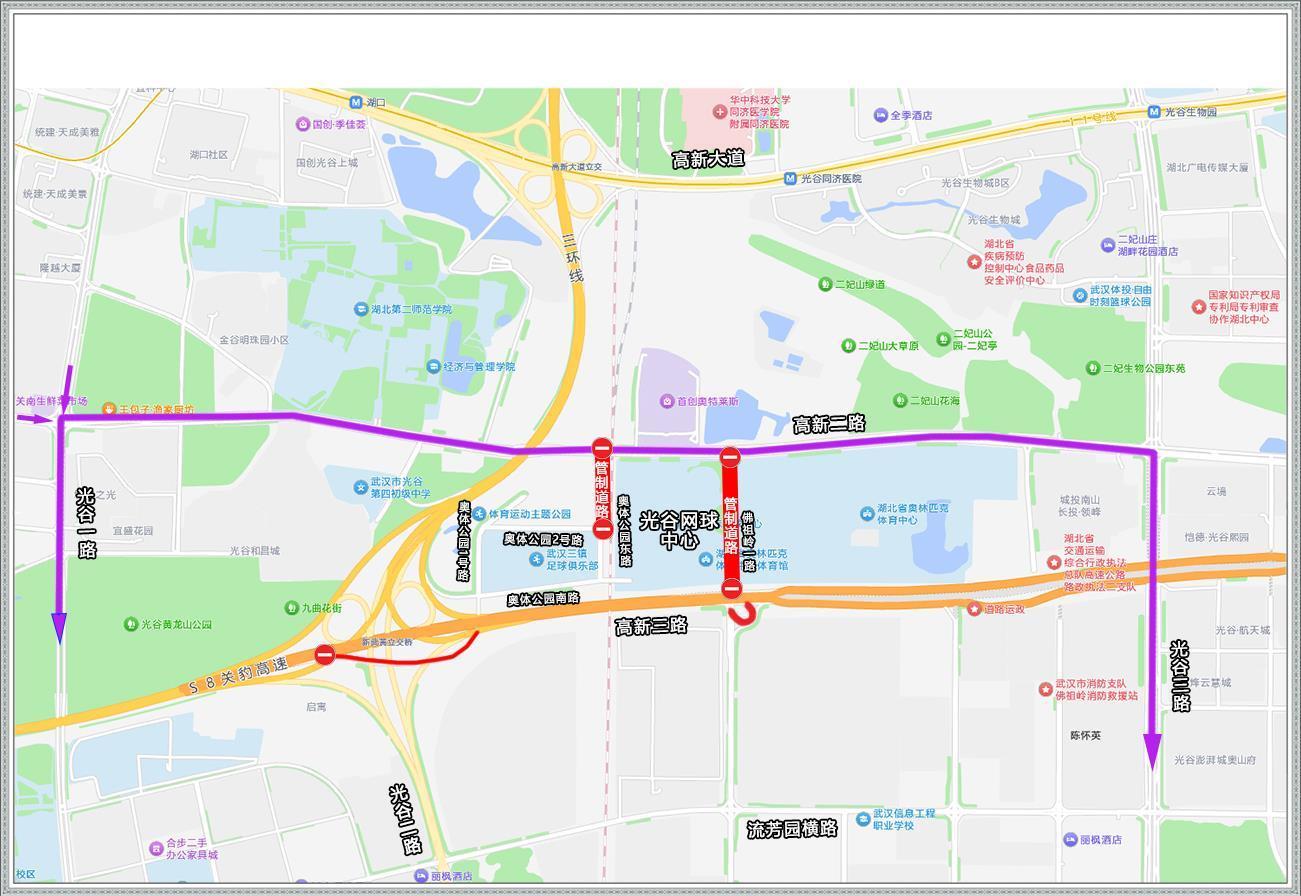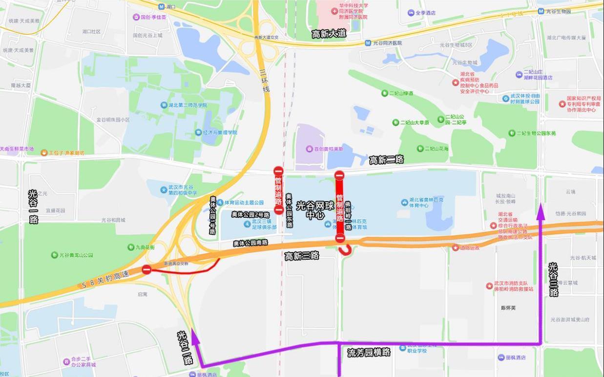 南向来车:建议绕行流芳园横路→光谷二路,或流芳园横路→光谷三路。