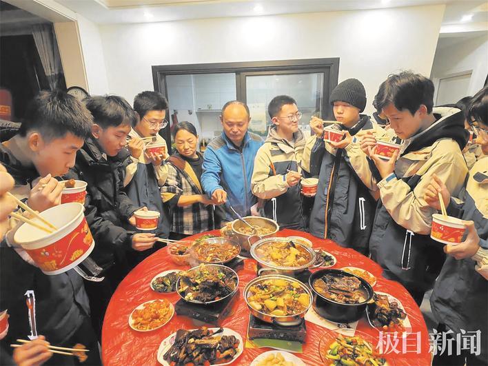 “我最爱吃程老师做的牛杂火锅,餐馆大厨都烧不出这个味道!”1月14日晚,湖北黄石市阳新县华成新都小区内,阳新一中高三年级主任程志勇家中挤满了26名学生,他们围在桌前,开心地吃着程老师做的美食。这一温馨画面,程志勇家里已上演了20多年。