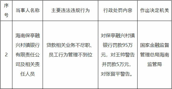 国家金融监督管理总局海南监管局对保亭融兴村镇银行罚款95万元,对王帅警告并罚款5万元,对张留平警告。