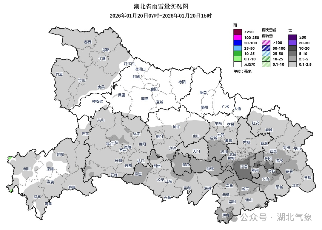 昨天(20日)鄂西南东部、江汉平原及鄂东地区出现小到中雪,其中武汉、鄂州、黄石北部等局地大雪,其他地区零星小雪。