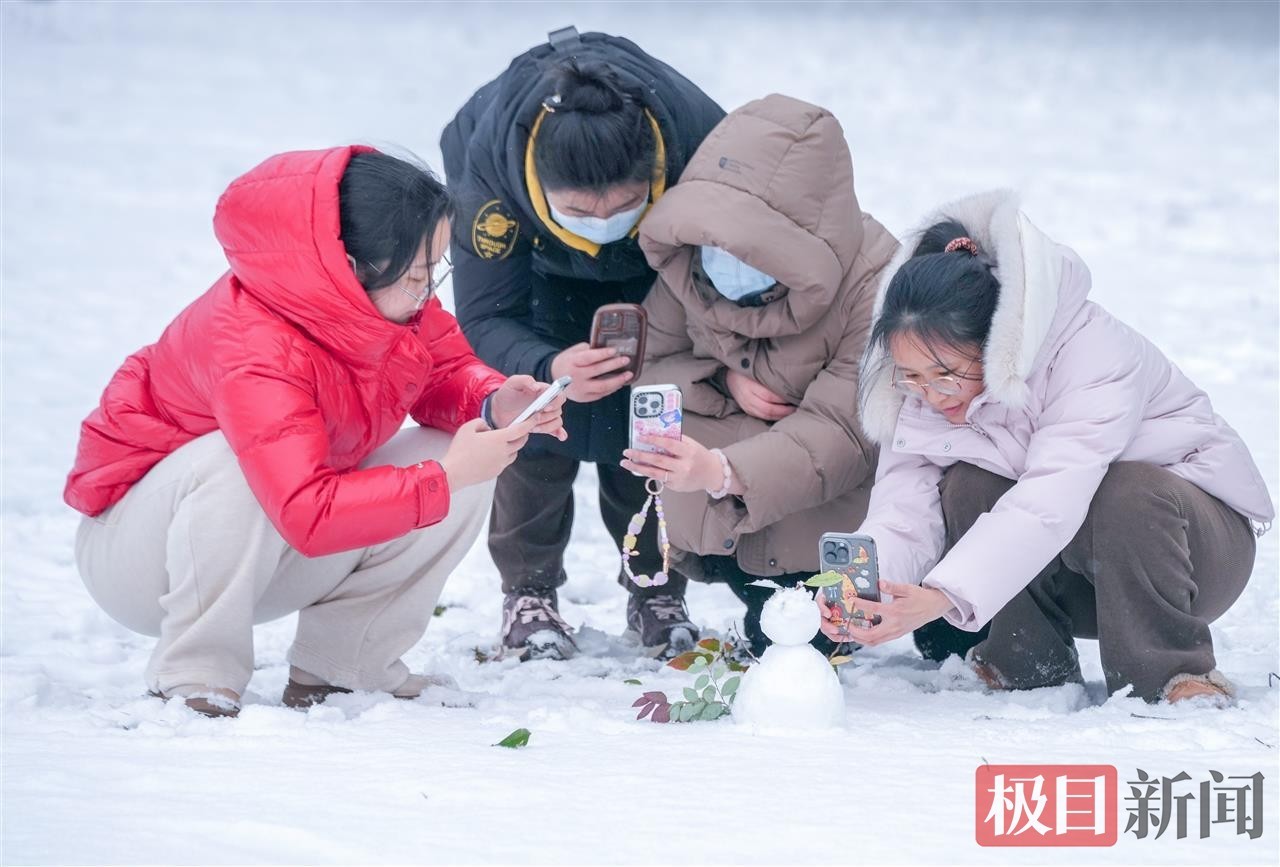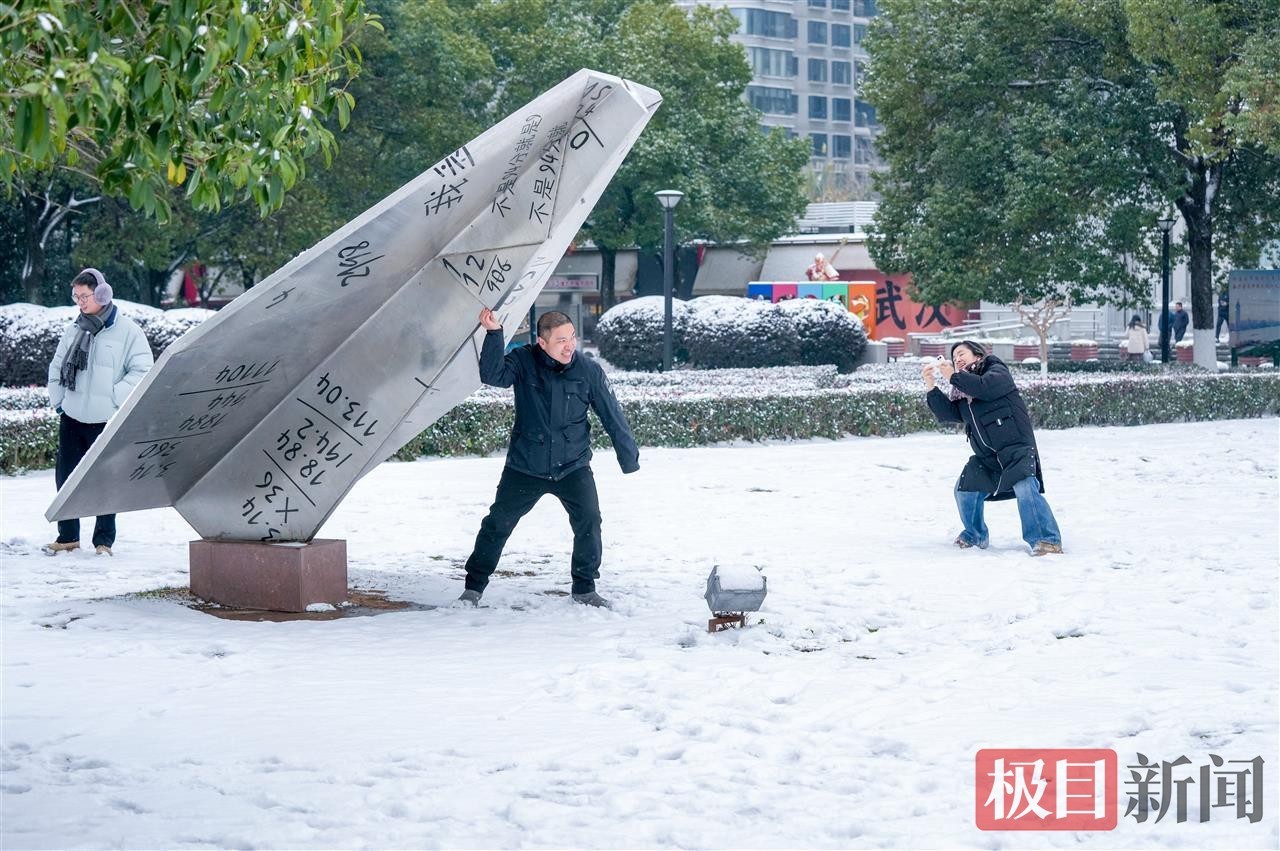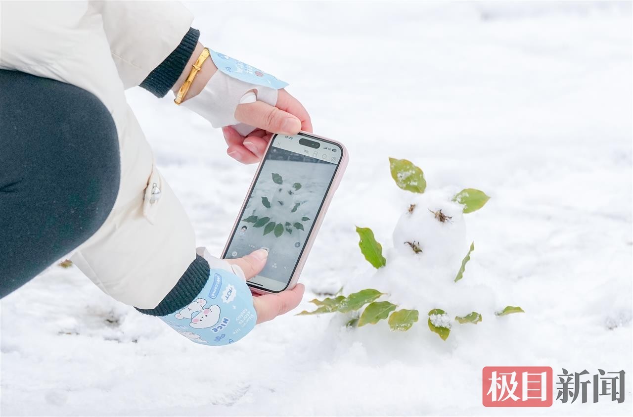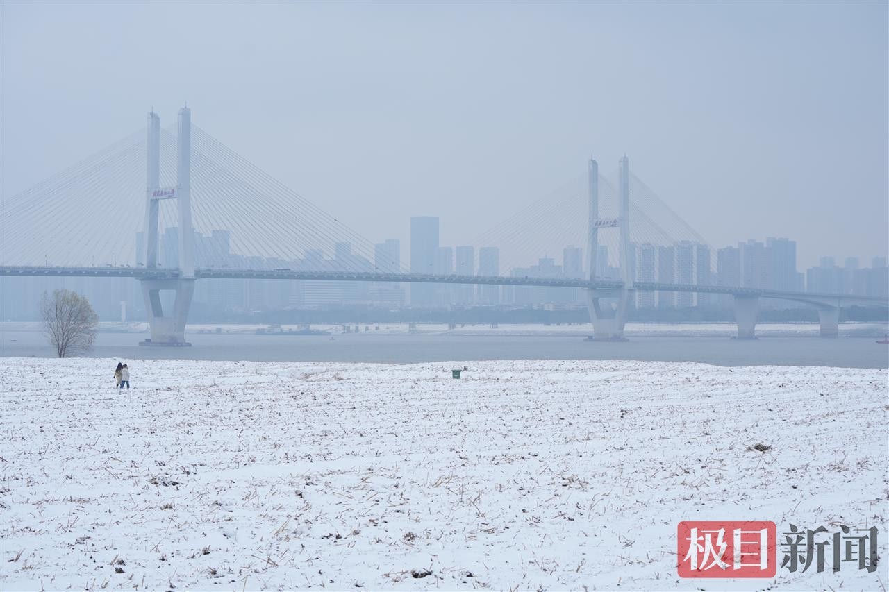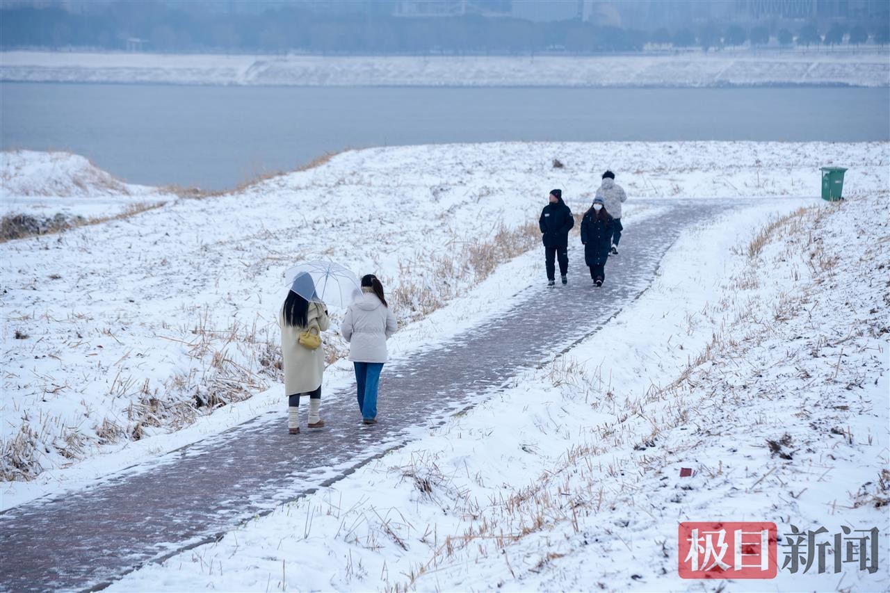 当天中午,极目新闻记者在汉口江滩看到,松软的积雪为江滩铺上厚厚的“白色地毯”,长江岸线与白雪相映成趣,呈现出童话般的唯美景致。尽管气温偏低,但寒冷并未阻挡市民的赏雪热情。不少在周边工作的市民利用午休时间前来打卡,大家或三五成群一起堆起憨态可掬的雪人,或在雪景中摆出各式造型拍照留念,欢声笑语让静谧的江滩充满生机活力。