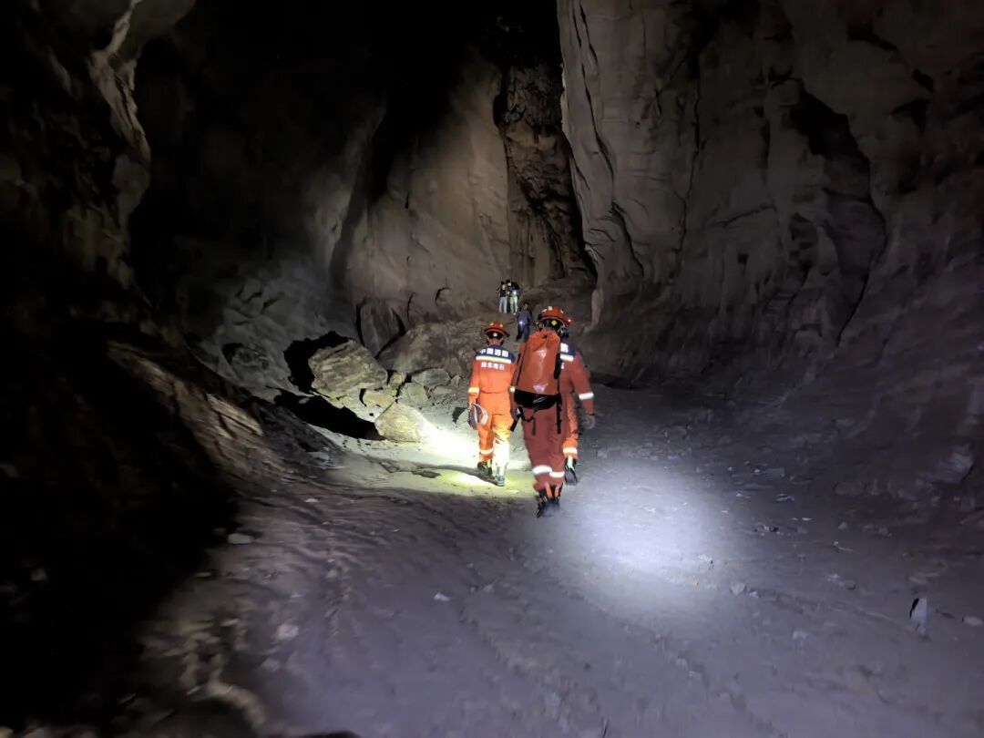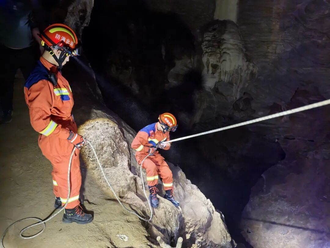 做好全面安全防护后,救援人员沿绳索小心翼翼向洞穴深处推进,精准定位到被困人员位置并展开专业施救。经过近半个小时的紧张有序处置,两名被困人员成功被救出,经现场检查,二人身体状况良好,无明显外伤。